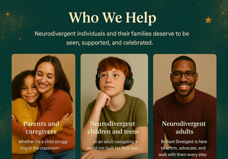 At Brilliant Divergent, we don’t just offer services — we deliver lifelines. Through bold advocacy, radical education, and soul-deep community, we meet families where they are and lift them toward where they deserve to be.